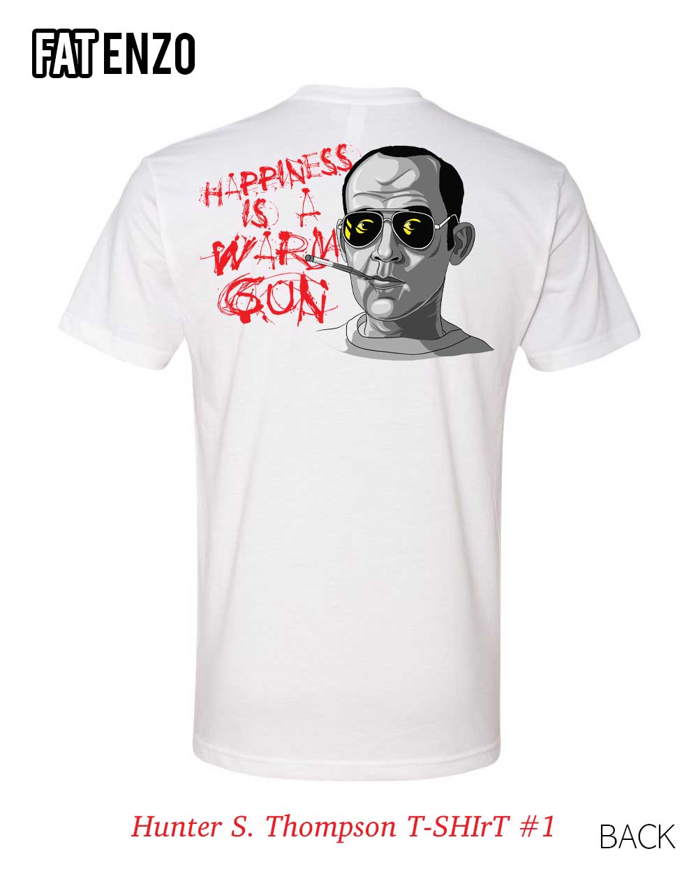 Back: Hunter S. Thompson portrait with “Happiness Is a Warm Gun” in wild, red, Ralph Steadman-esque scrawl